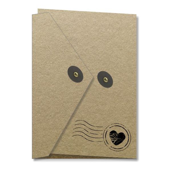 Porta foto lusso in cartoncino variabile fustella tipo busta con nastrini per la chiusura. Sfondo in colore marroncino stile carta da pacchi e francobollo postale con cuoricino