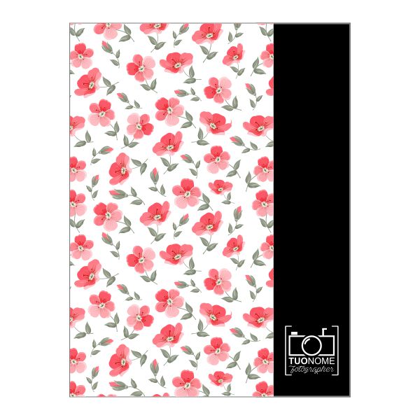 Porta foto lusso cordonato in tre parti con chiusura asimmetrica, realizzabile su cartoncini variabili e decorazioni con fiori colorati ed aletta nera