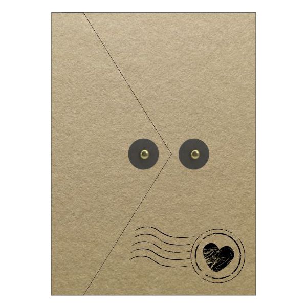 Porta foto lusso in cartoncino variabile fustella tipo busta con nastrini per la chiusura. Sfondo in colore marroncino stile carta da pacchi e francobollo postale con cuoricino