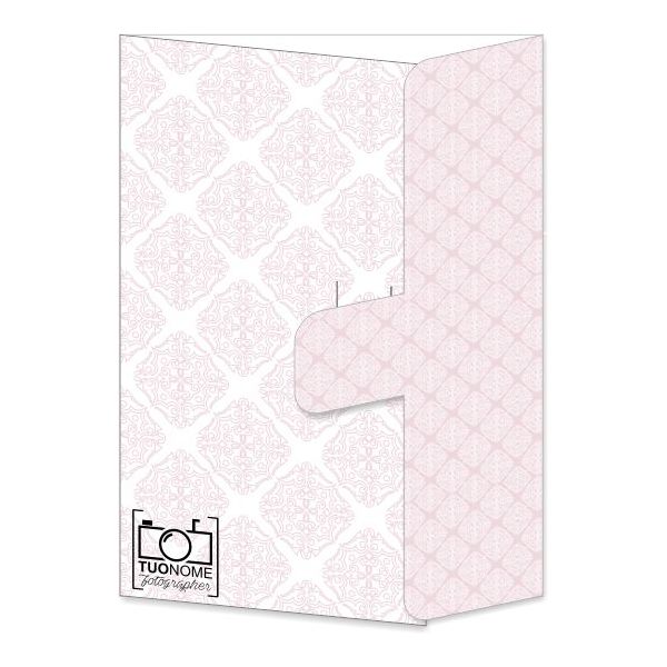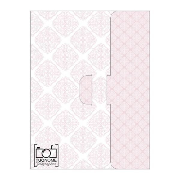 Porta foto lusso in cartoncino variabile fustellato con forma chiusa di pochette. Stampa fondo grafico con decorazioni ornamentali e trama sul lembo della busta di colore rosa