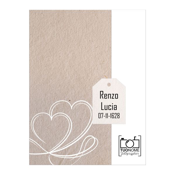 Porta foto lusso in cartoncino variabile, rettangolare a due ante con ticket personalizzabile con nomi sposi e data matrimonio effetto martellato con cuoricini